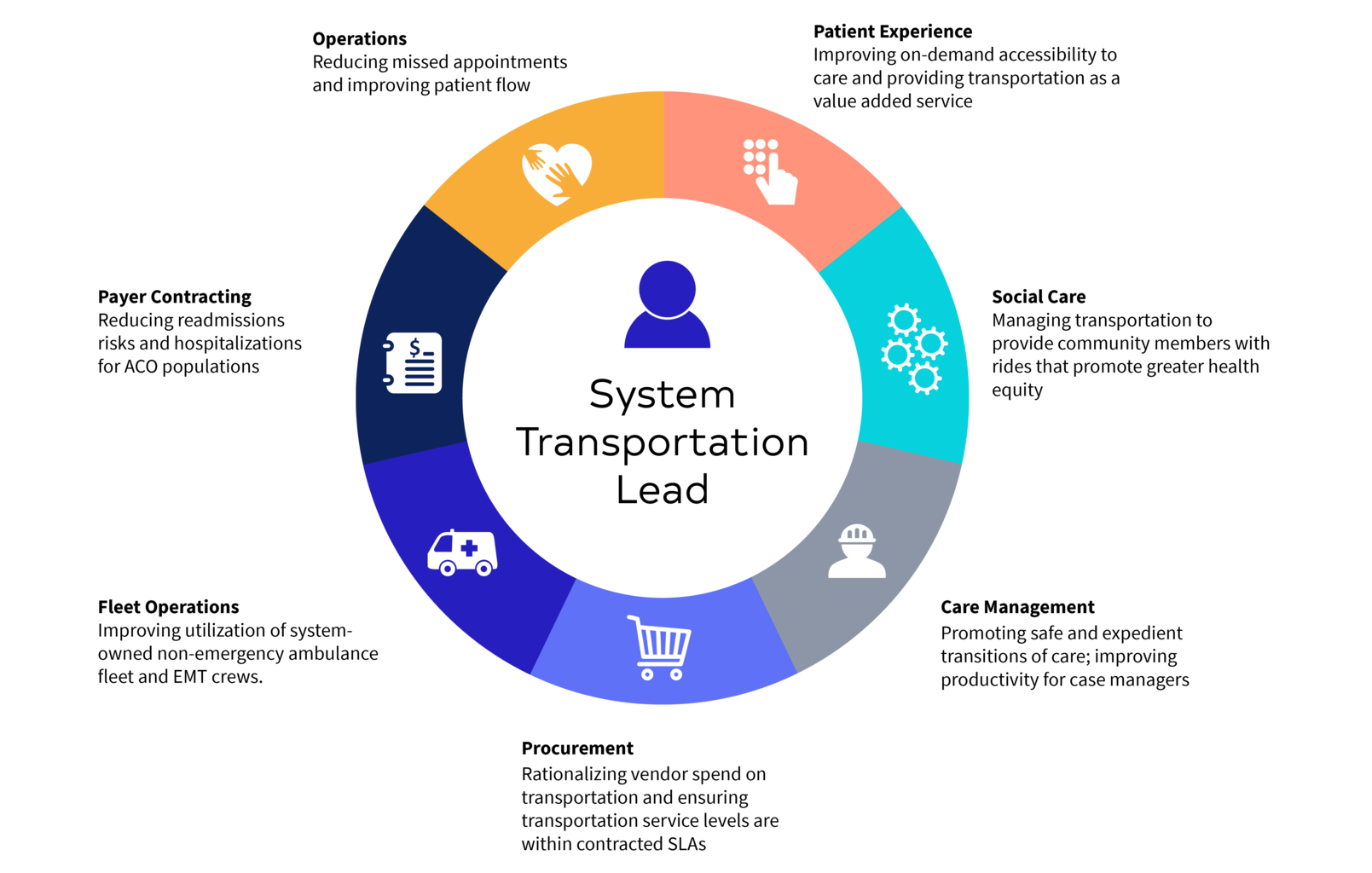 There is no better time to think strategically about who owns patient transportation in your health system. CMS continues to experiment with bundled payment (BPCI) and shared savings (MSSP) programs where downside financial risk is at play, and care coordination and preventative health are critical for success. In parallel, social determinants of health programs are expanding and Medicare Advantage plans are adding transportation as a plan benefit. To champion the physical wellbeing of your patients and the financial health of your system, establish an enterprise patient transportation role that owns all levels of transportation in all care settings.
