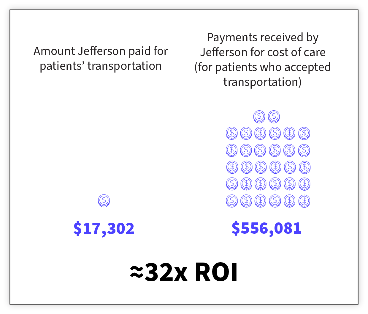 In May 2020, Jefferson Health reported a notable improvement in appointment adherence. In 2018, the average no-show rate for radiation and medical oncology appointments was 4.3%. In 2019, the average no-show rate reduced to 3.7%. Additionally, there was evidence of a significant ROI. For every dollar that SKCC spent on providing patients with transportation to infusion and radiation appointments, it received nearly $32 back in reimbursement (see figure 1).